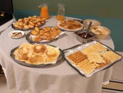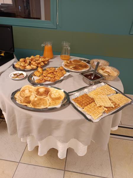 Cela fut un succès ! Crêpes , Gaufres , accompagnées d'un chocolat maison , mini viennoiseries, Chouquettes , jus de fruit , pain , beurre,confiture , laitages .