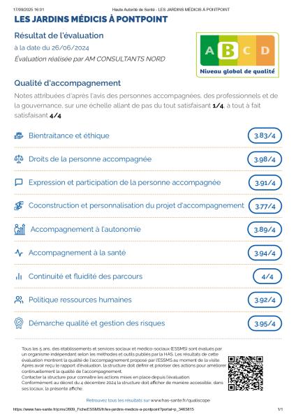Comme vous le savez sans doute, la résidence Les Jardins Médicis a fait l’objet d’une évaluation externe sur la base du référentiel de la Haute Autorité de Santé le 26/06/2024, conformément aux exigences réglementaires en vigueur.
